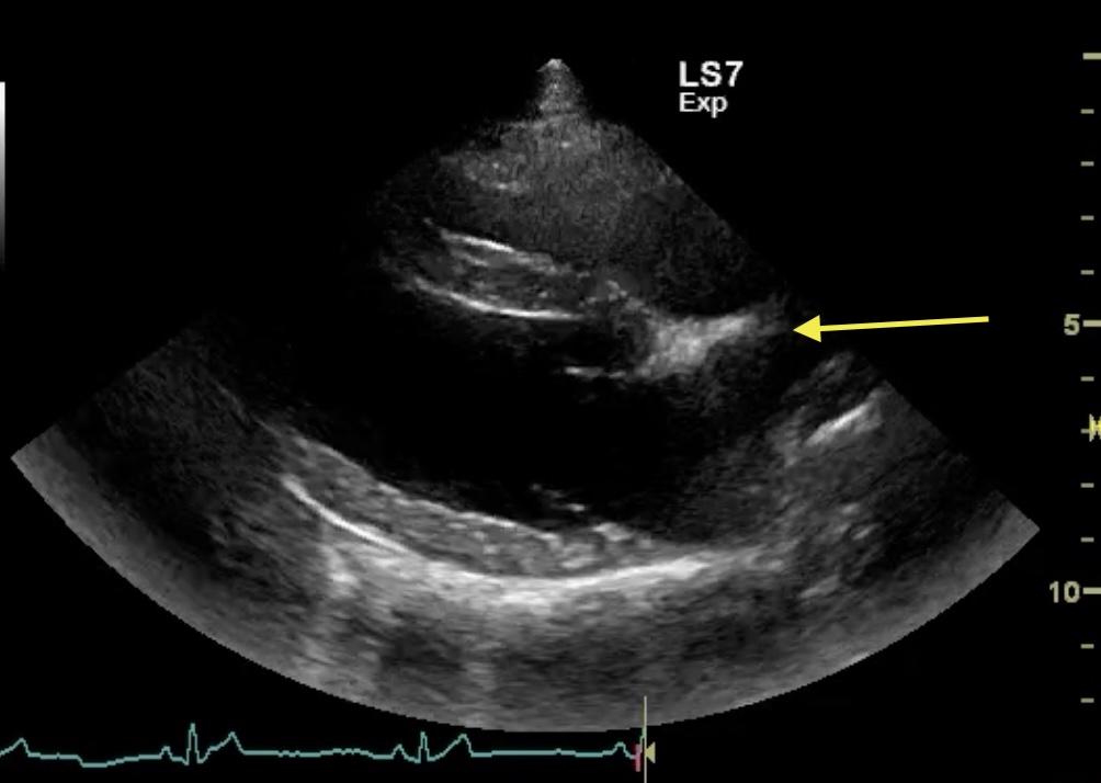 Included are clips and some stills of a 6 1/2 year old, 31.4Kg, male neutered Labrador Retriever presented for a worsening cough over two weeks duration. Radiographs revealed a more generalized interstitial lung pattern with small dispersed areas revealing alveolar patterns. Heart appeared normal in size to slightly enlarged. Blood work was uneventful. Ultrasound was used to determine if cough was cardiogenic or related to lung pathology. I didn’t observe anything drastic on echo?Bradycardia and low normal heart rates were observed. Allometric scaled LA suggested slight enlargement while the LAD:AO was 1.8. Lung scan revealed increased B lines on both sides of thorax with a few small subpleural areas of lung consolidation. On the left side some shred signs were also observed. What are your thoughts.