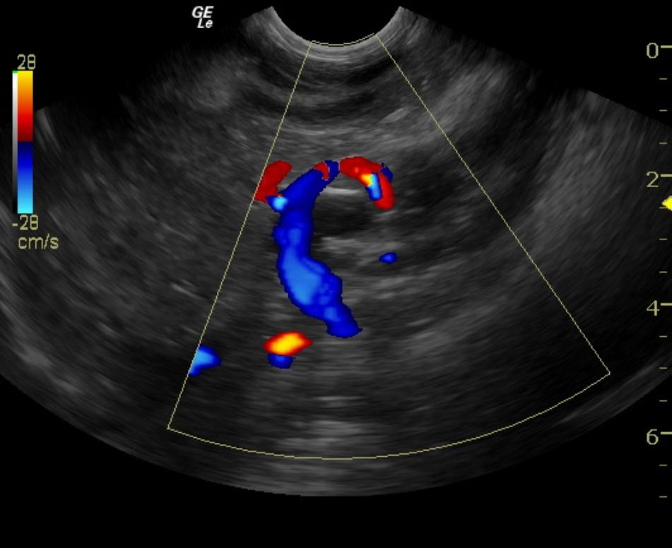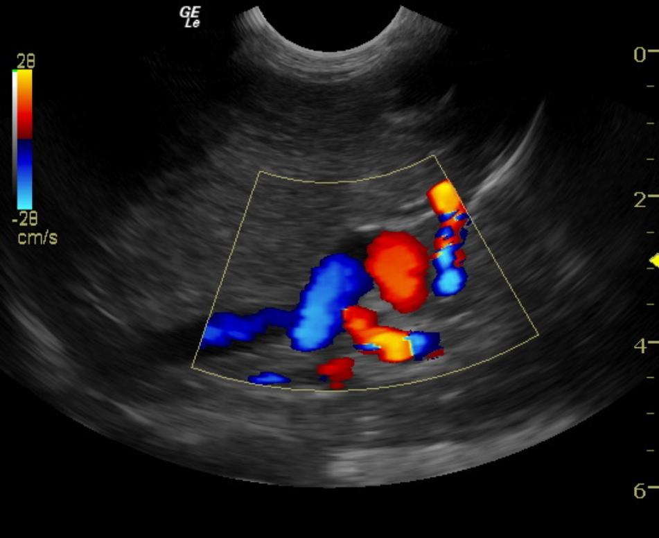 The liver was mildly subnormal in size. The parenchyma was hypovascular. The portal hilus in this patient revealed an extrahepatic shunt that appeared to be deriving from the portal vein with tortuous contour and measured 1.0 cm in width with dorsal direction with entrance into the thorax adjacent to the vena cava and aorta. This is strongly suggestive for splenoazygos shunt as the vena caval volume appeared normal and entered into the diaphragmatic inlet as did the aorta. The vena cava to aortic ratio was 1:1. The vena cava measured 0.8 cm at the portal hilus and also at the diaphragmatic inlet. The aorta measured 0.9 cm at the hilus and diaphragmatic inlet. Therefore, the most logical shunt would be an extrahepatic portoazygos shunt, likely splenoazygos in origin. The shunt appears to derive from the portal vein prior to the pyloric outflow cranial to the right kidney and dorsally directed. Ameroid constrictor measurement should be for a shunt that measured approximately 1.0 cm.