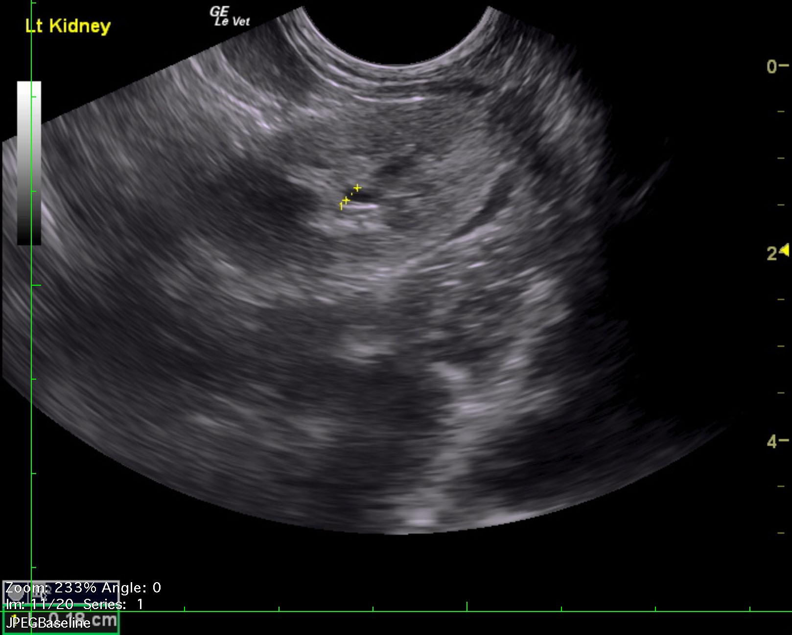 Moderate interstitial nephrosis renal pattern in the left kidney with slight pyelectasia. This is likely pyelonephritis.