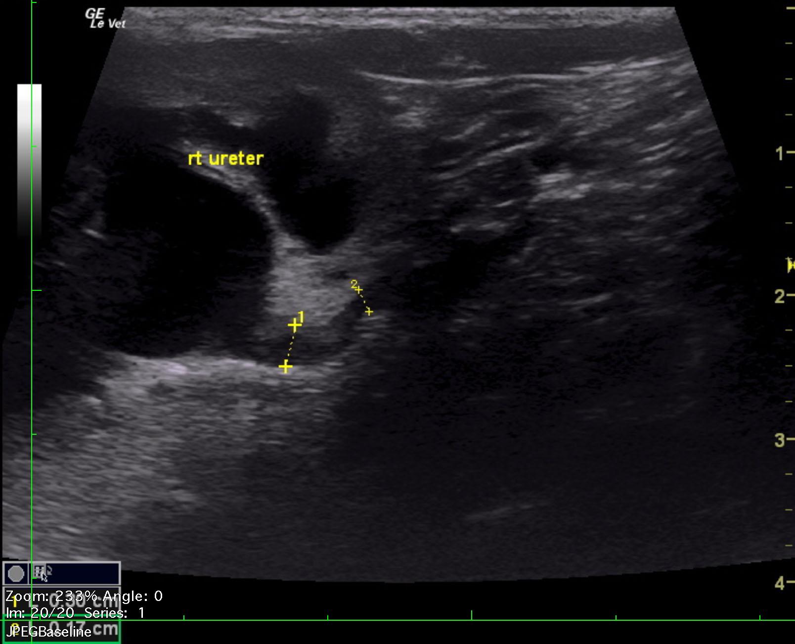 The right kidney in this patient presented moderate hydronephrosis and increased cortical echogenicity. Swollen contour and renomegaly was noted. The right kidney measured 5.85 cm. Renal pelvic dilation was noted and measured 1.22 x 2.0 cm. Power Doppler assessment appeared to be mildly subnormal in the renal cortex. The right ureter was dilated near the renal pelvis at 0.3 cm and 0.17 at the distal aspect. Echogenic debris was noted within the ureter. This is likely consistent with a blood clot. The ureter was followed distally approximately 2.0 past the renal pelvis. The cause of obstruction is unknown, likely stricture. The left kidney revealed a chronic interstitial nephrosis pattern with subcapsular fluid accumulation and pyelectasia that measured 0.18 cm. Cortical infarcts were noted in the left kidney.