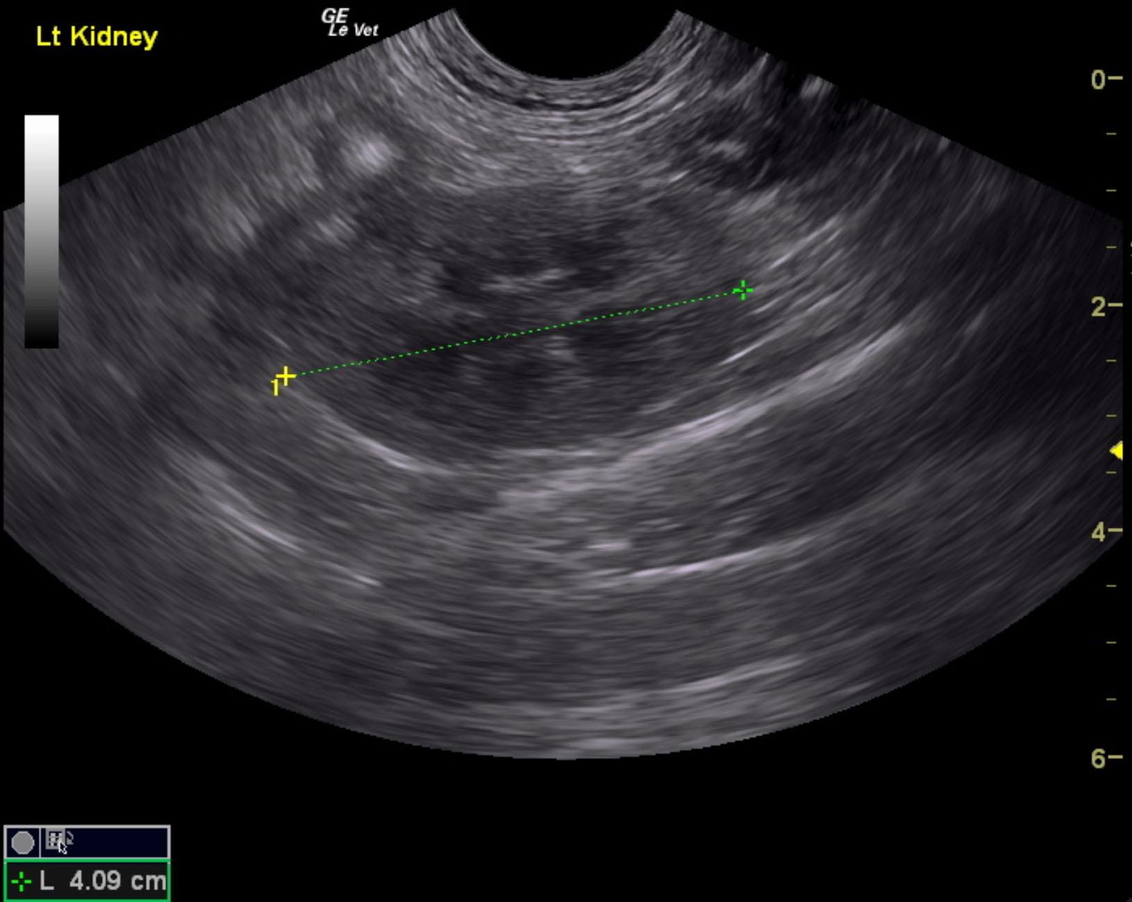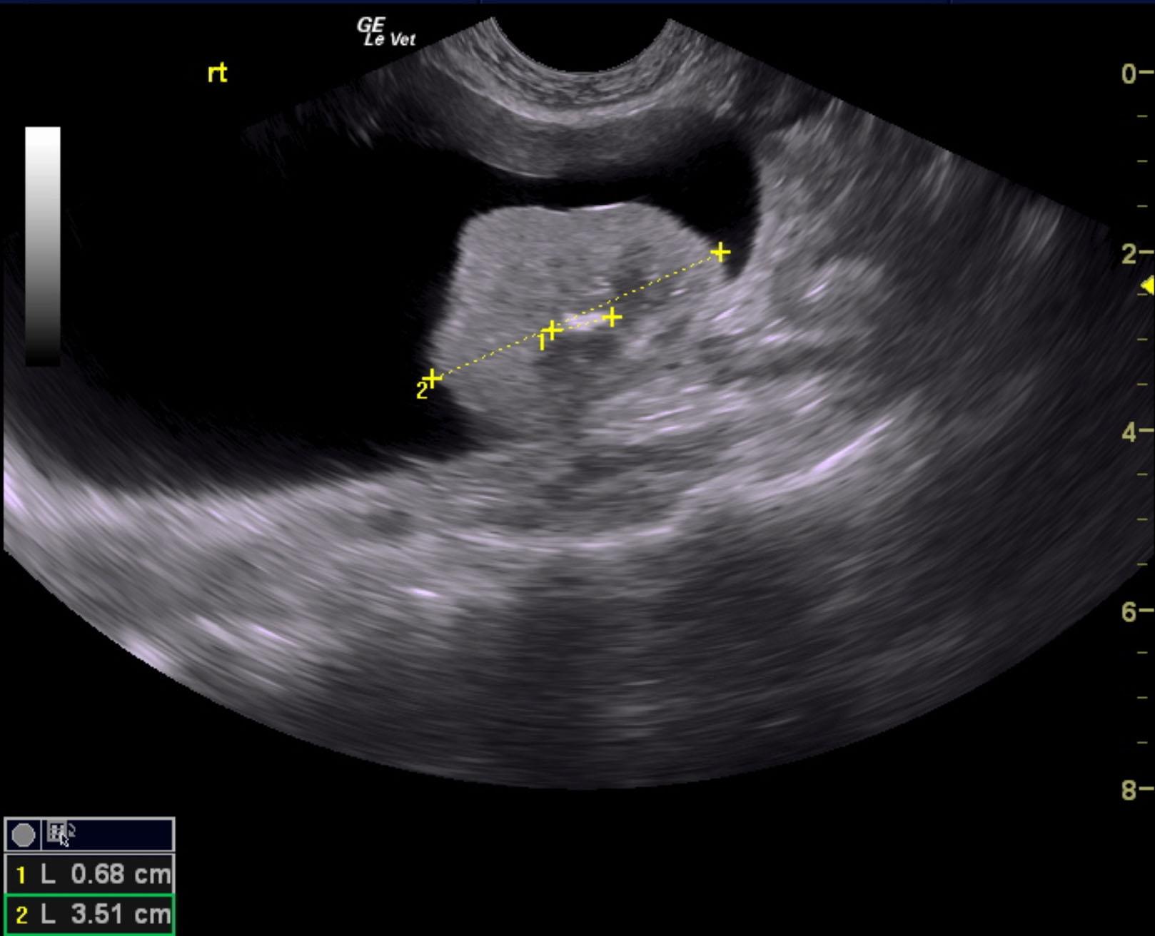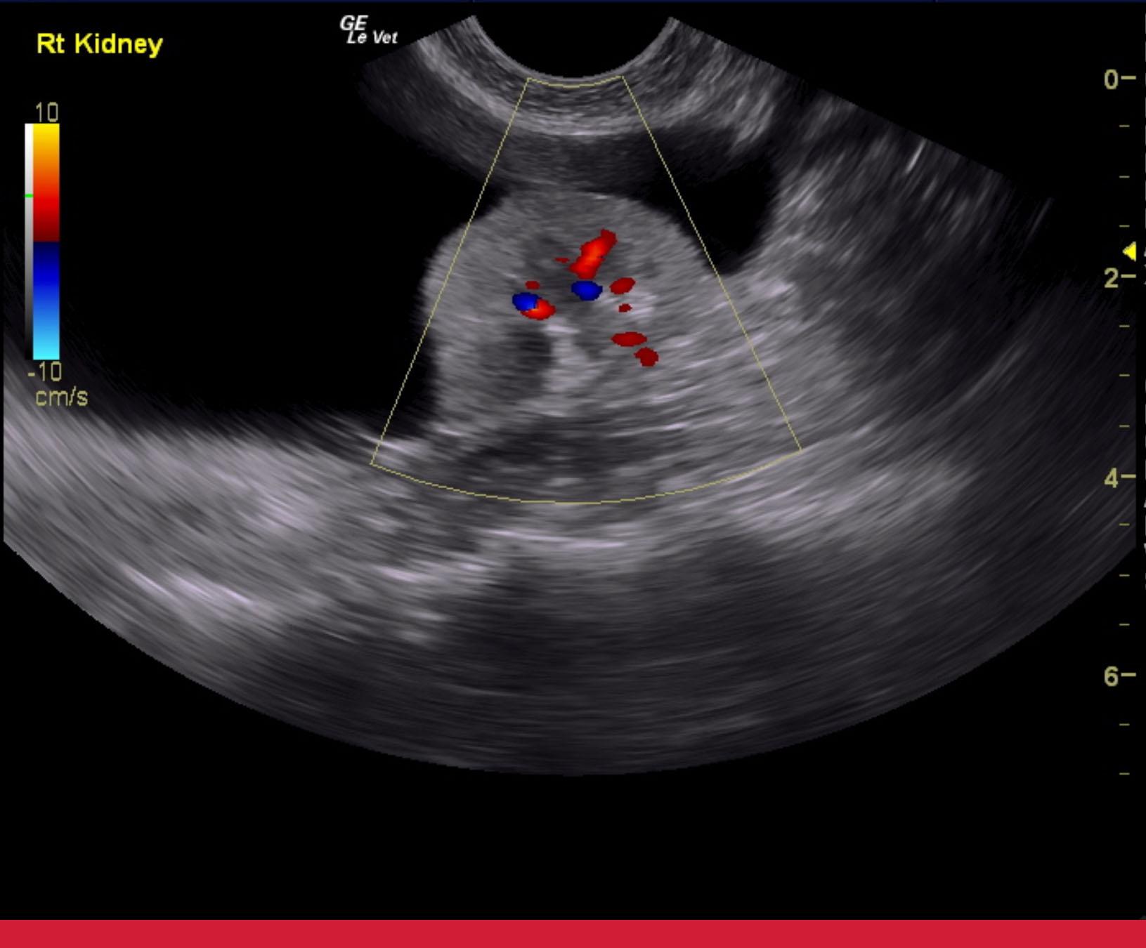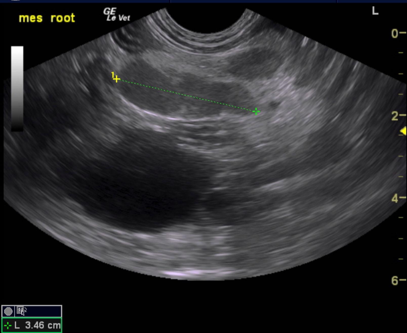 The right kidney in this patient presented chronic interstitial nephrosis pattern with irregular contour and focal, cortical collapse. Pelvic calculus was noted that measured 0.68 cm. The parenchymal portion of the right kidney measured 3.58 cm, yet a perirenal pseudocyst was noted with mild, echogenic debris. The pseudocyst extended for approximately 8.0 cm. Slight pyelectasia of the right kidney was noted and measured 0.23 cm. Color flow of the right kidney appeared to be subjectively subnormal. The left kidney was largely unremarkable with mild degenerative changes with a slightly thickened cortex and measured 4.09 cm. Mesenteric lymph nodes were enlarged and measured 3.4 x 1.0 cm. Irregular contour was noted. FNA is recommended
