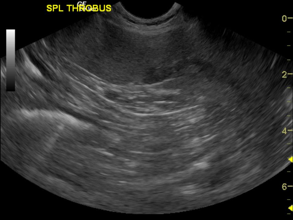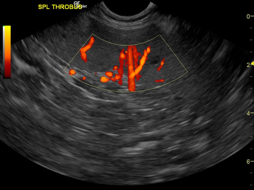 The spleen was largely uniform. However, a splenic thrombus was noted at the caudal branch of the spleen entering into the main splenic vein at approximately 4.0 cm. This area of the splenic vein was void of power Doppler signal.