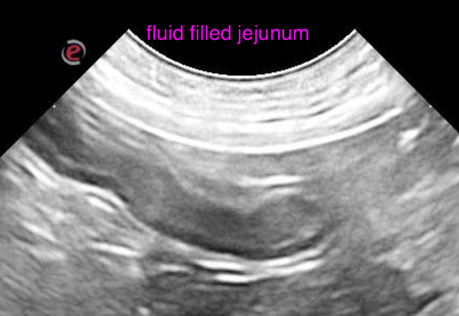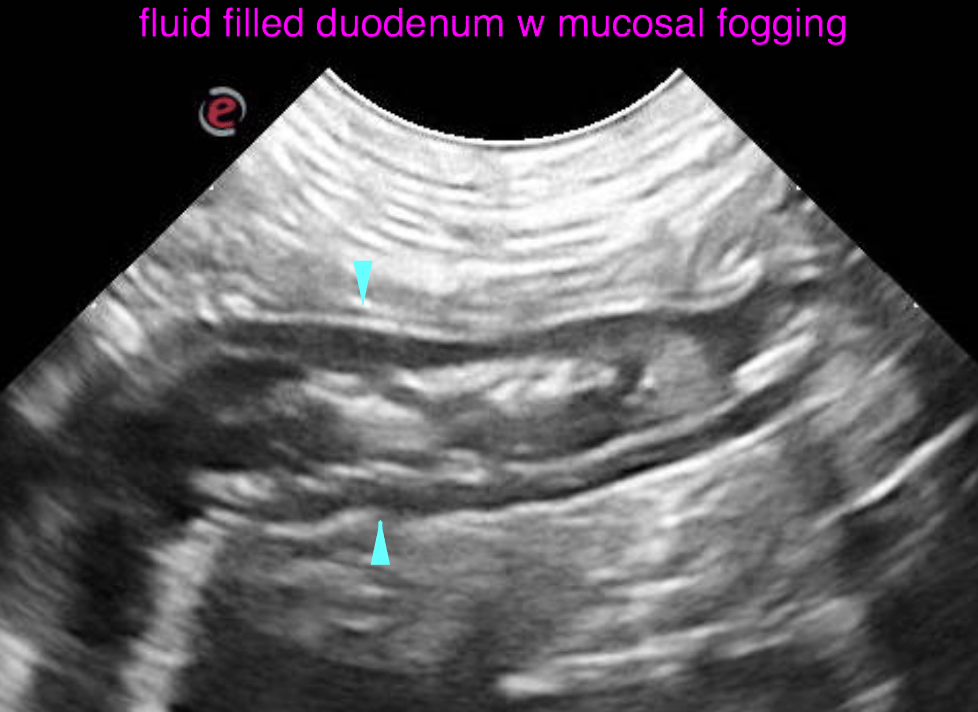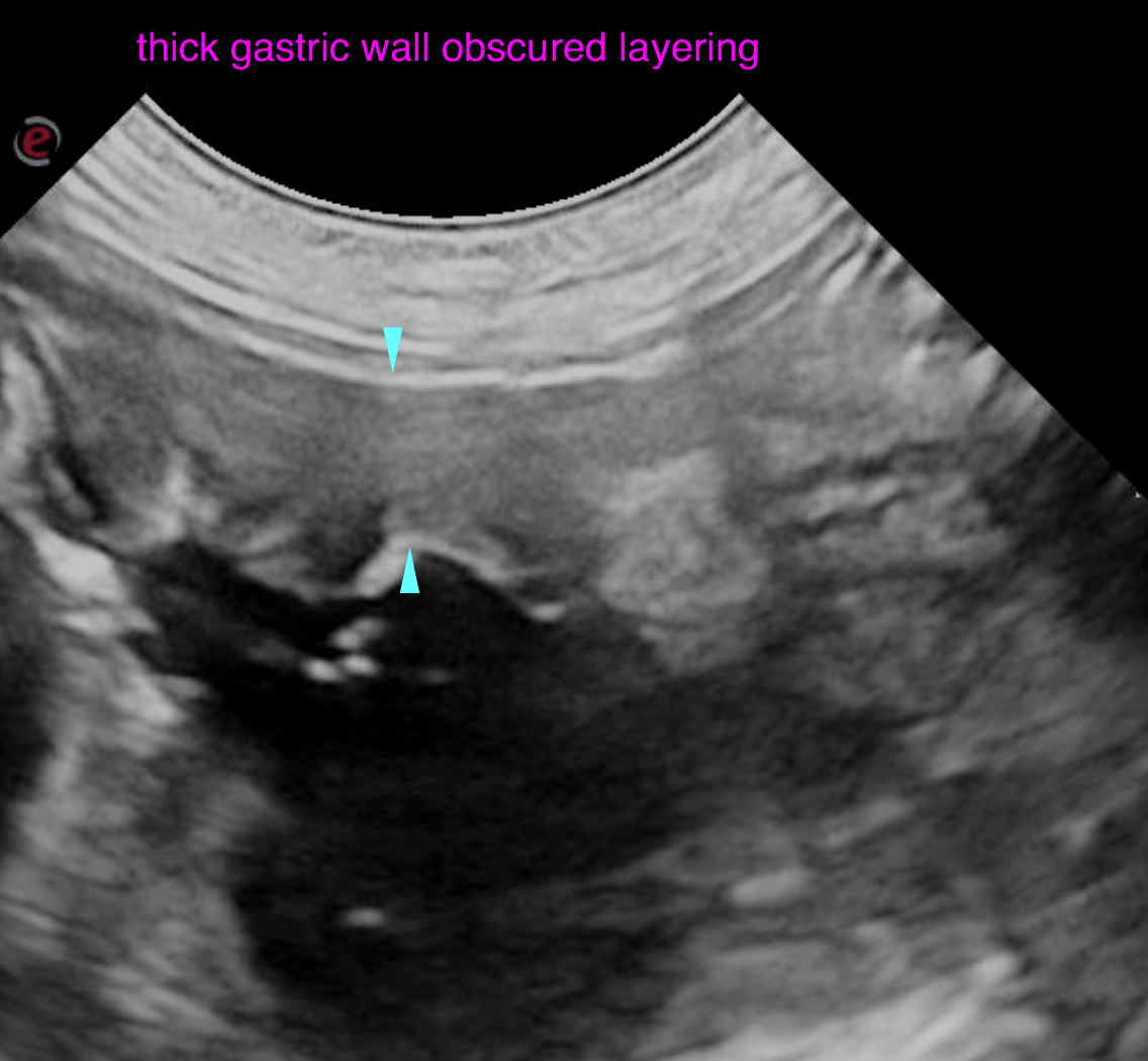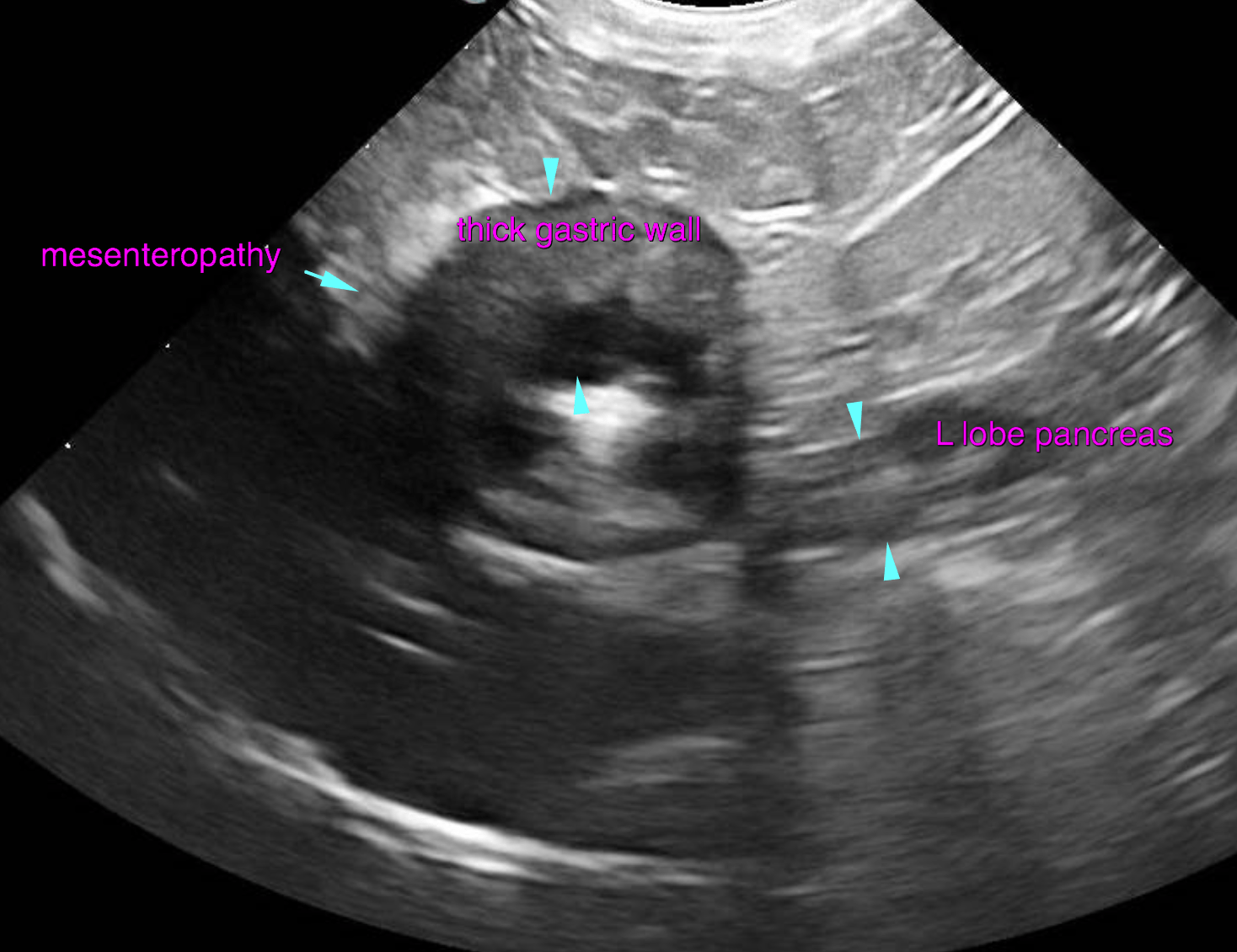 The left and right lobe of the pancreas are embedded in a slightly hyperechoic mesentery, but within normal limits for size, shape and echoarchitecture. The gastric wall presents moderate generalized wall thickening emphasizing the submucosal layer. The interrugal wall thickness is up to 5 mm. The wall layering is moderately obscured. The mucosal surface is slightly irregular. A moderate amount of fluid is present within the stomach. The surrounding mesentery is mildly increased in echogenicity with slightly ill defined echotexture. The stomach is hypomotile. The duodenum is slightly dilated with fluid, presents hypermotility and mucosal fogging. The wall layering is witho normal limits. The jejunum presents similar changes as the duodenum. There is no obstructive pattern of the digestive tract.