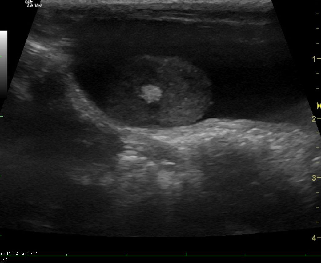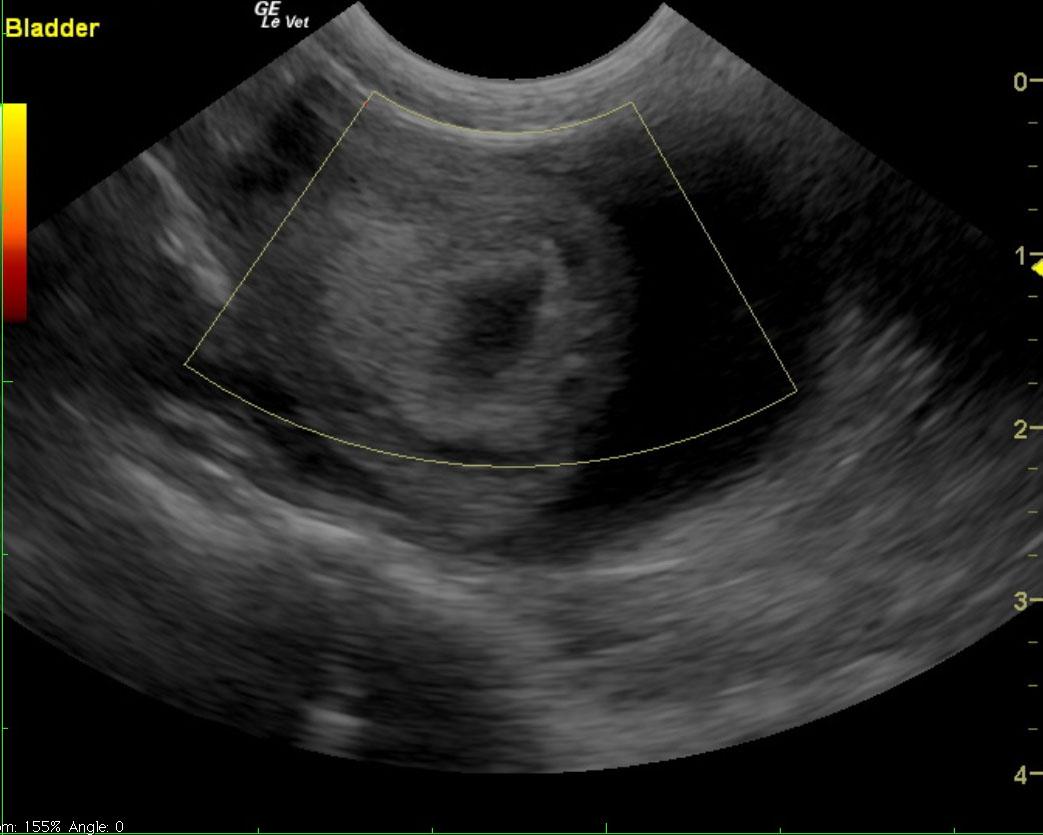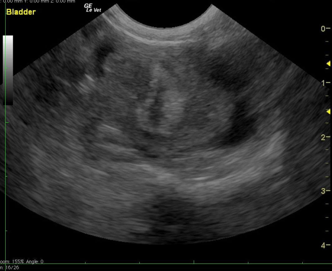 The urinary bladder in this patient presented a 2.0 cm, mixed echogenic blood clot or mass that appeared to be attached to the apical wall. Loss of mural detail in the wall was noted, which suggests an organized mass more so than a blood clot.