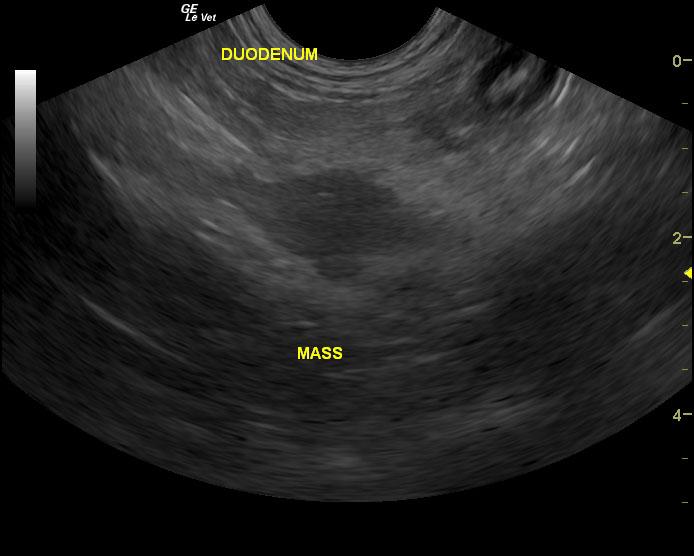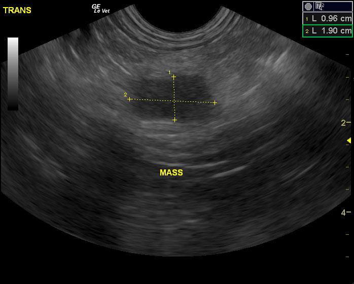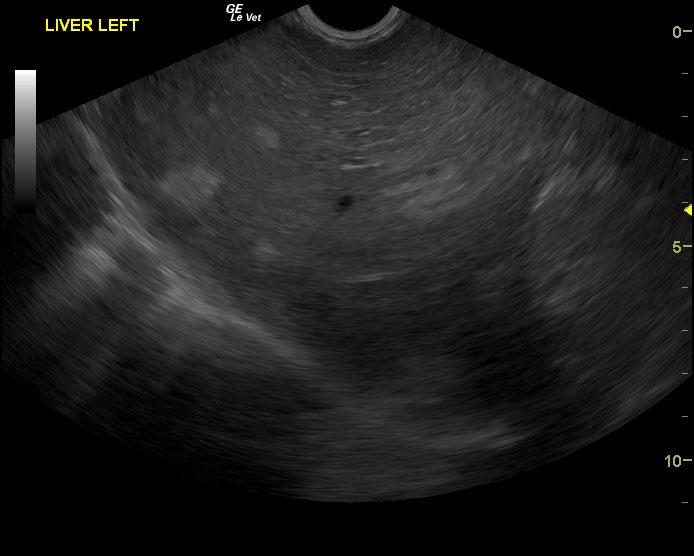 A 13-year-old FS Springer Spaniel that had been vomiting intermittently after a dental and skin mass removal that had been done a few days previously presented for an examination. The only abnormality on physical examination was a slight pot bellied appearance. Urinalysis showed an inappropriate specific gravity (1.018), bilirubinurea, proteinurea, and bacteriuria. CBC and serum biochemistry showed thrombocytosis, elevated ALP, elevated GGT, and elevated ALT activity, elevated cholesterol and elevated triglycerides. T4 was normal.