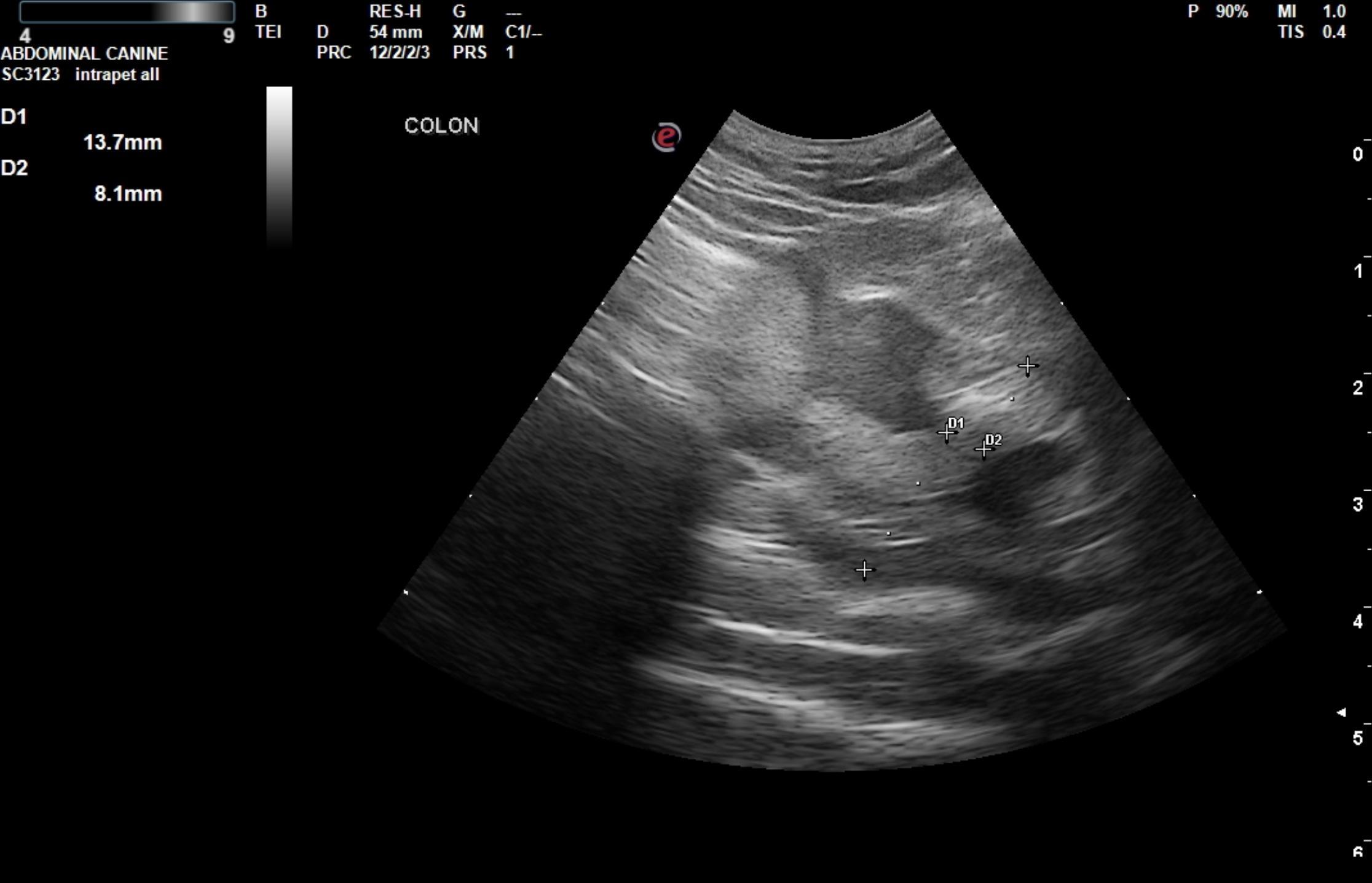 From the perineal approach the colonic mass appears to be reach the colorectum. It does not appear overtly resectable without splitting the pelvis. However, the distal portion of the colonic mass appears to be involved in the colorectum itself. Surgical consultation could be considered. There was no overt evidence of metastatic disease noted. Three view chest radiographs would be warranted. This is likely carcinoma with a minor potential for colonic lymphoma or very mild potential for granulomatous disease. FNA could be attempted if the sonographer is able to find an adequate window for sampling