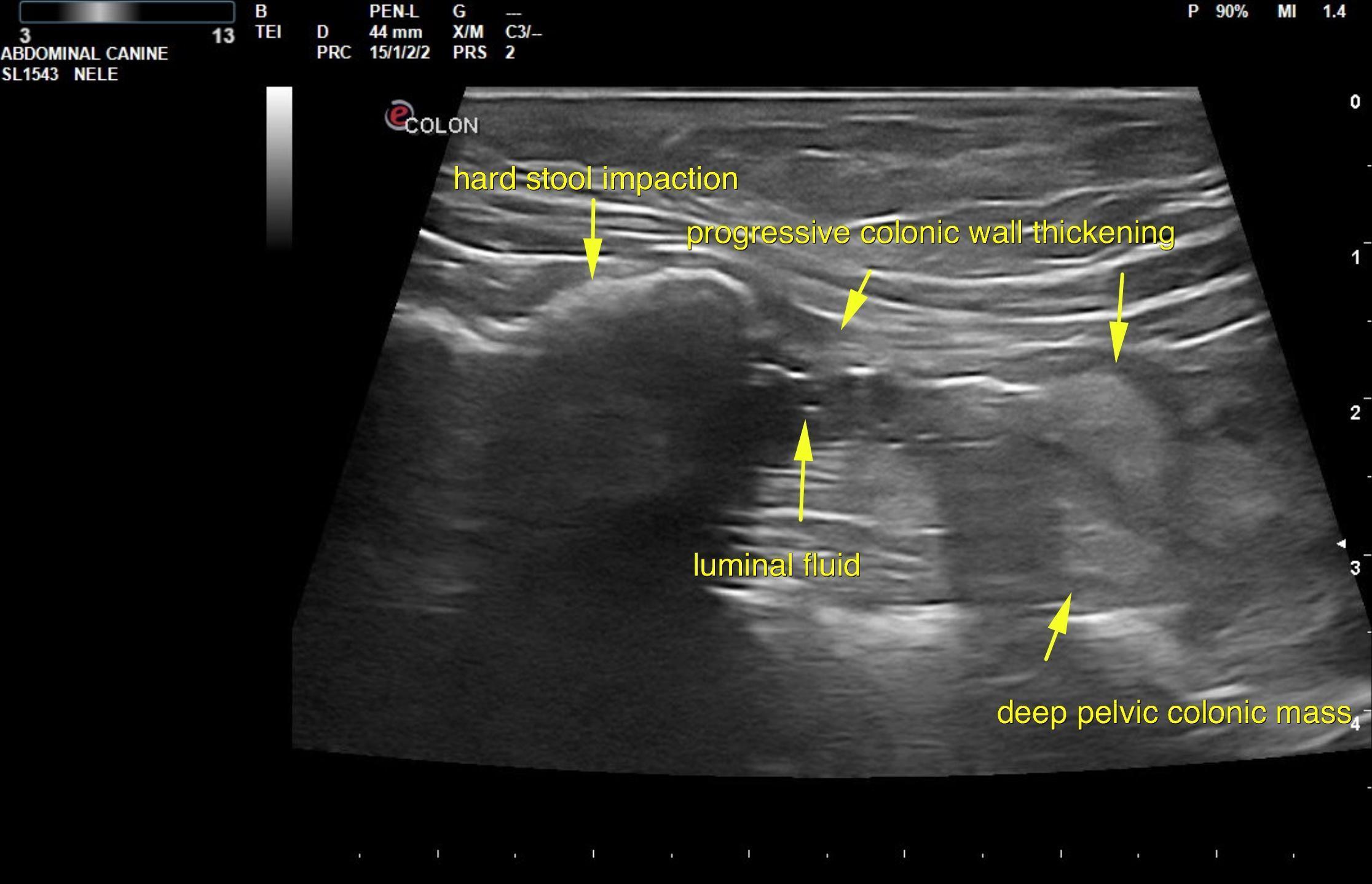 The colon in this patient revealed an approximately 2.0 x 4.0 cm concentric mass with an obstructive pattern. Hypoechoic, ill defined colonic wall was noted. Stool was obstipated from the level of the deep pelvis proximally to the ileocecal junction. The colonic mass appears to be in the distal colon in the pelvic inlet. The mass extended into the colorectal region.