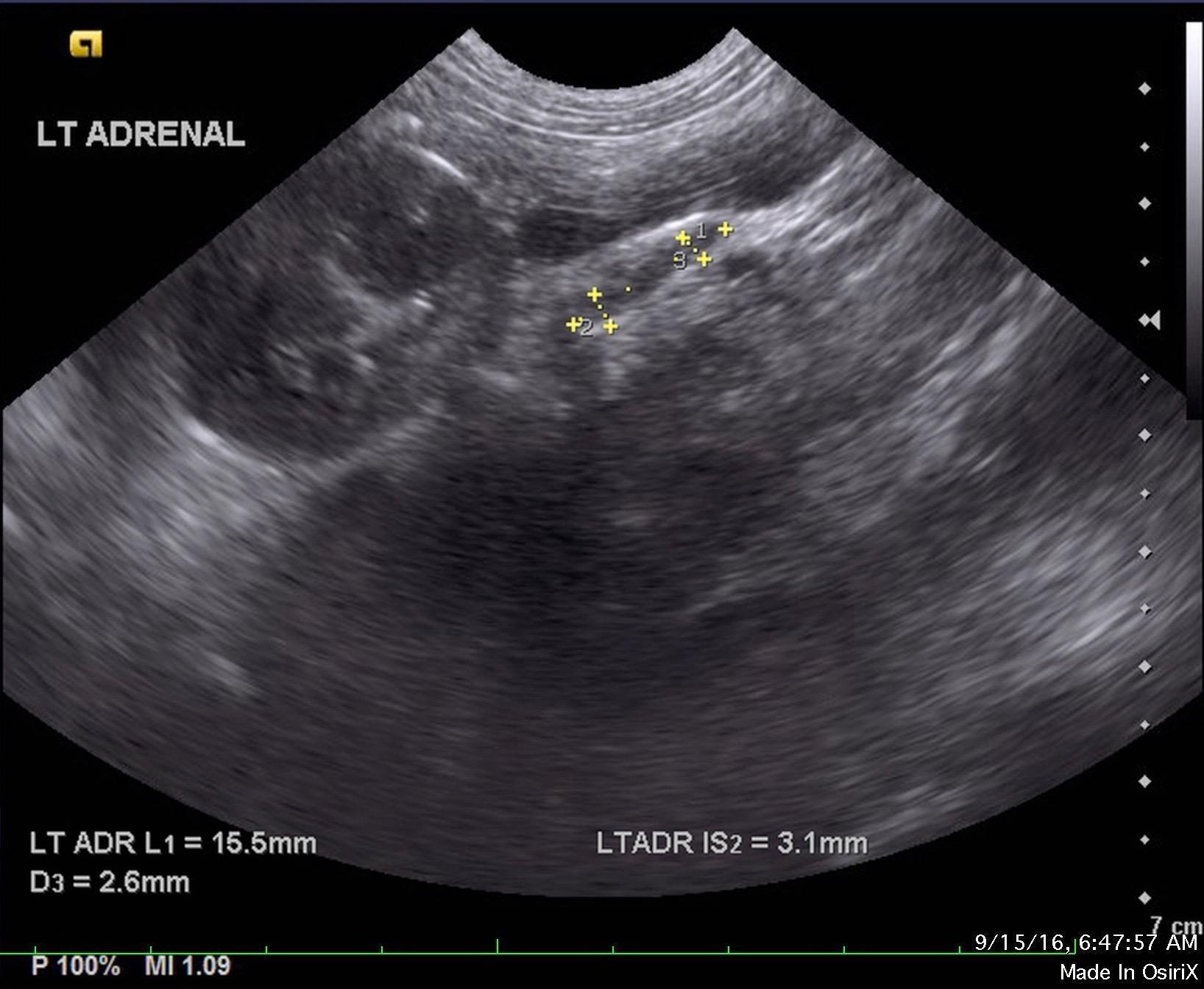 History: A 5-month-old male English springer spaniel was presented for evaluation of acute onset diarrhea and vomiting. On physical examination lethargy, dehydration, hypothermia, and bradycardia was present. Abnormalities on CBC and serum biochemistry were mild lymphocytosis and mild eosinophilia, azotemia, hyperphosphatemia, hypercalcemia, hyponatremia and hypokalemia.