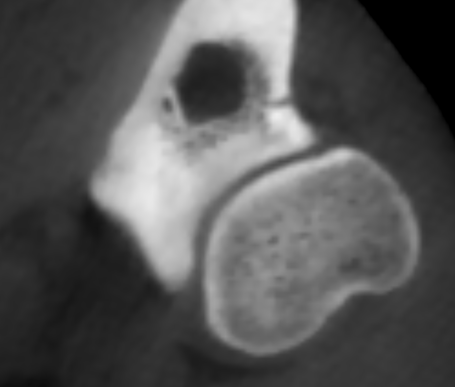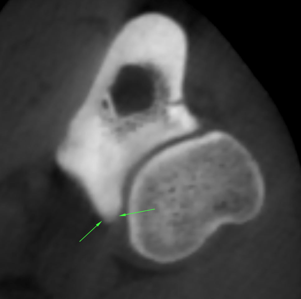 CT of the elbows – The tip of the medial coronoid process was irregular in outline with a small hook-shaped extension. There was a faint fissure line separating the tip of the medial coronoid process incompletely. The base of the coronoid process was increased in opacity and presented loss of trabecular pattern. The abaxial surface of the medial coronoid process was blurred and presented a mild and heterogenous decrease in opacity.