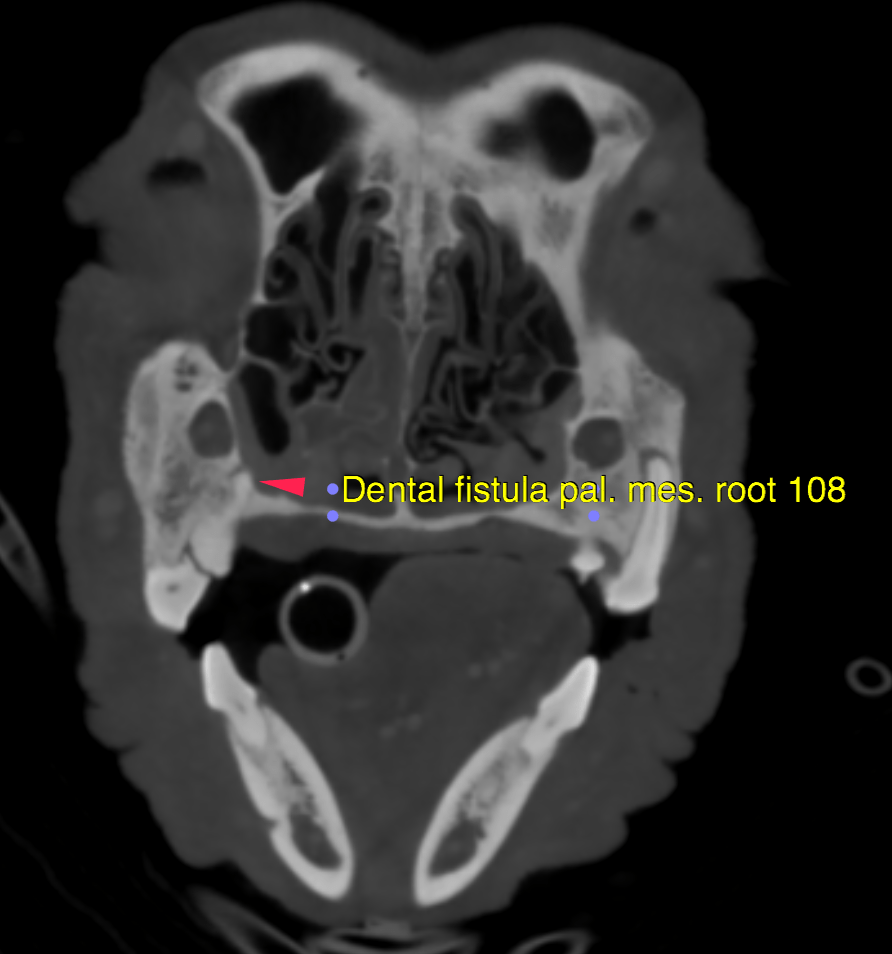 • Chronic tooth root fracture triadan 108 with oro-nasal fistula, apical tooth root granuloma and secondary chronic rhinitis with focal destrusion of the nasal turbinates
