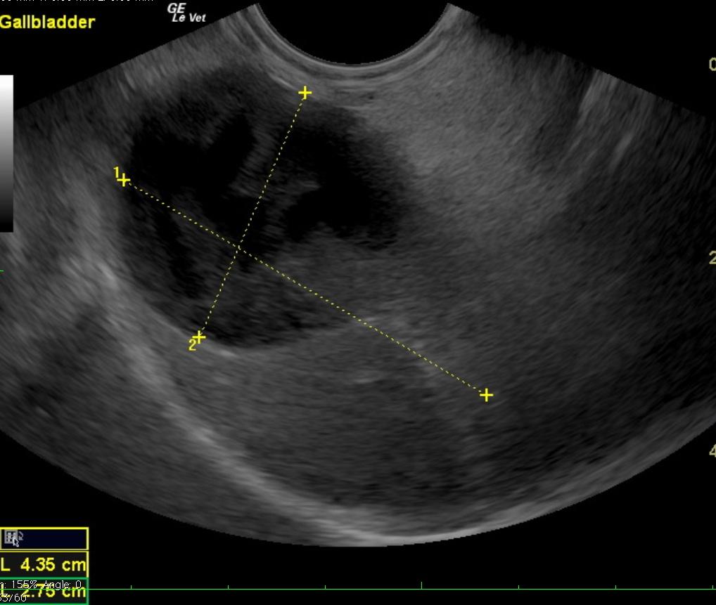 A 12-year-old FS Bichon Frise dog with history of bladder stones was presented for vomiting for 24 hours with wanting to eat but unable to hold any food down. On physical examination the mucous membranes were tacky, light pink, and slightly icteric, the abdomen was extremely tense and painful, and there was decreased skin turgor. Abnormalities on CBC and blood chemistry were leukocytosis, monocytosis, neutrophilia, basophilia, elevated ALP activity, hyperbilirubinemia, hyperalbuminemia, and hypercholesterolemia. The patient was treated with I.V fluids, antibiotics, and anti-emetics. A recheck bilirubin level after several hours of fluid therapy showed a moderately elevated bilirubin.