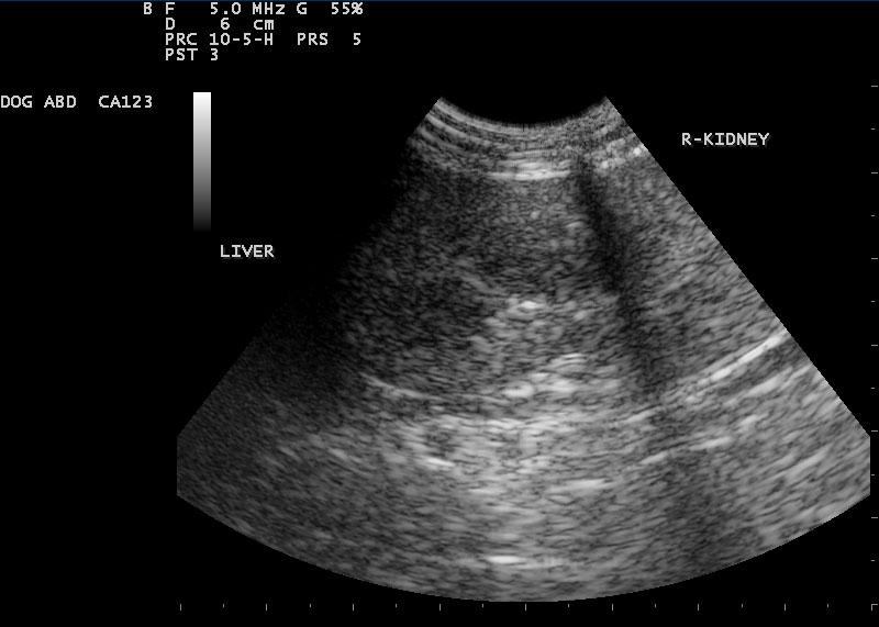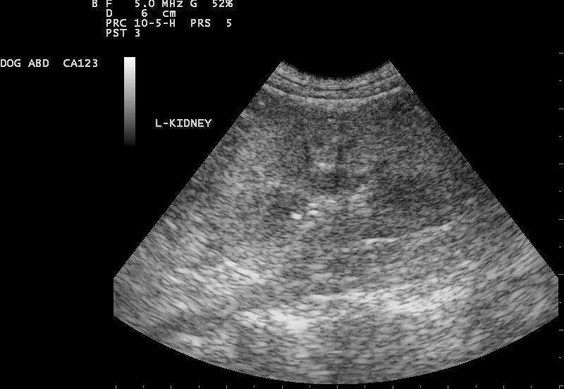 A 10-month-old intact male toy poodle dog was presented for evaluation of acute onset of vomiting. Initial lab work had shown azotemia (creatinine 3.3, BUN 95), which progressively increased over 3 days (creatinine 9, BUN 151). Severe proteinuria was present on urinalysis.