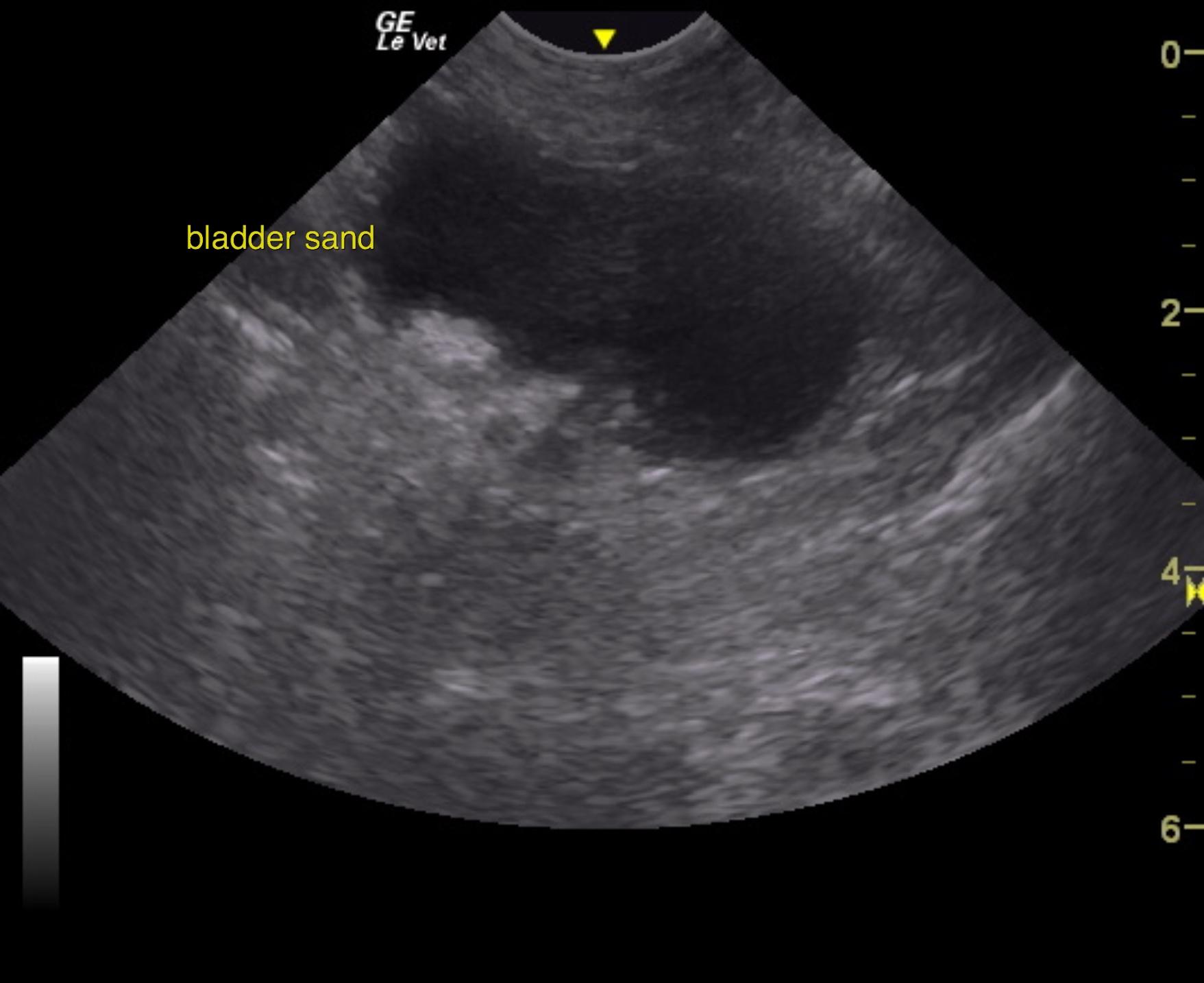 The urinary bladder presented a minor amount of suspended debris, dependent debriswithout acoustic shadowing. The ureteral jets were normal with normal urine flow.