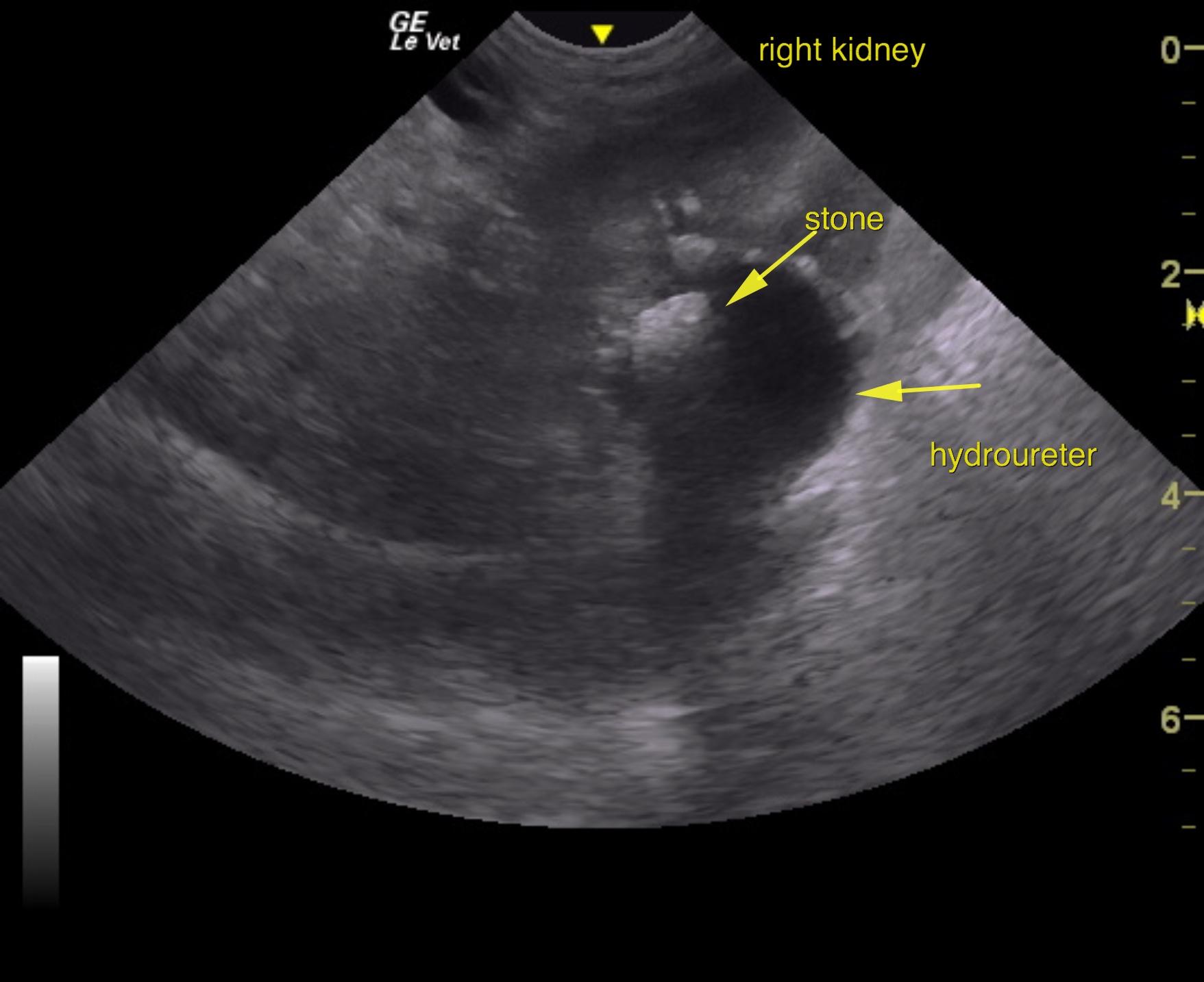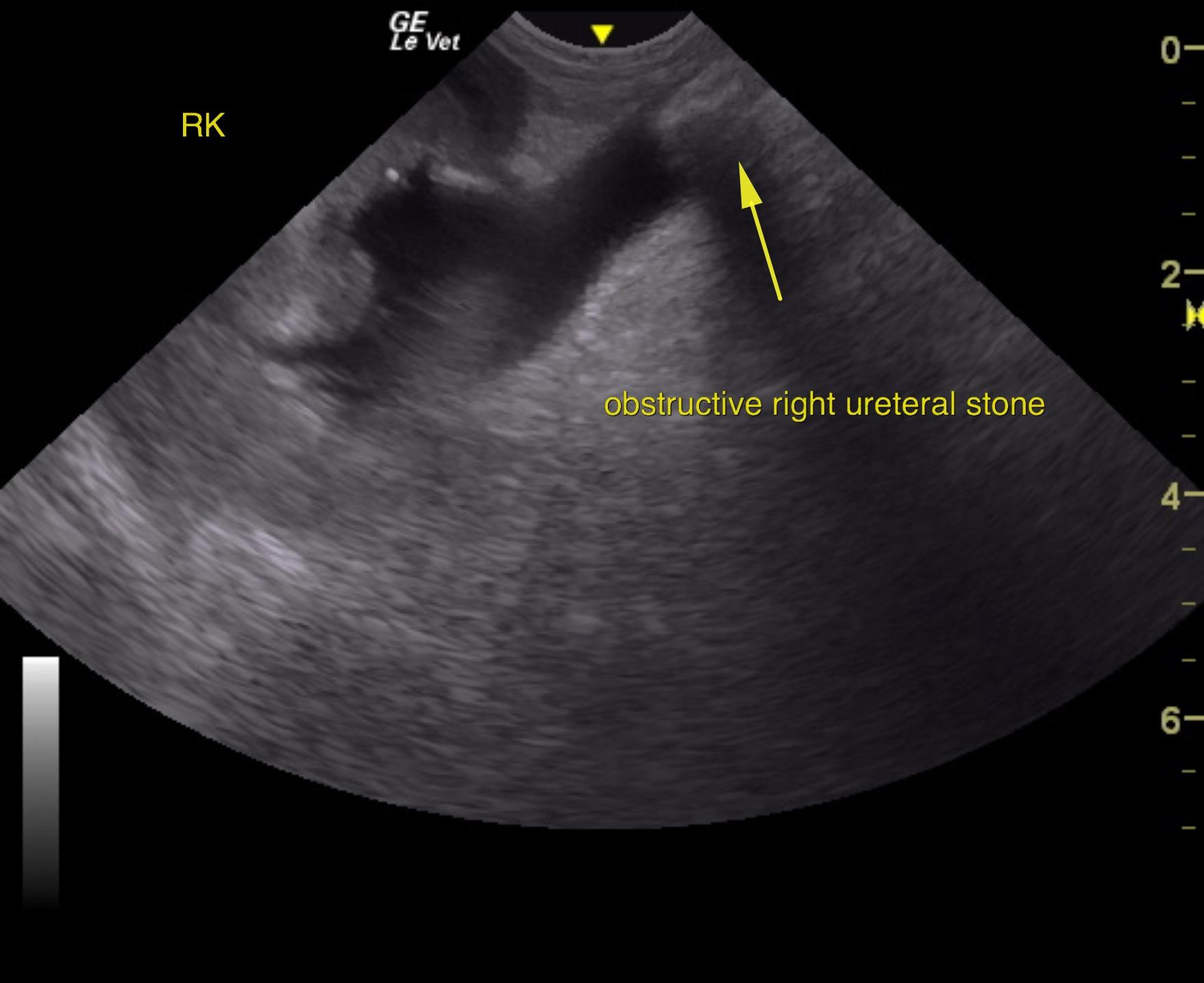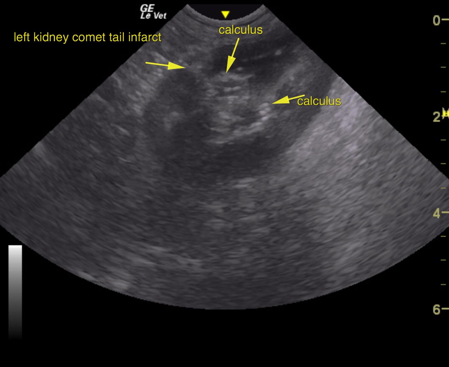 The left kidney presented slight, comet tail infarct with corticomedullary calculi that were small enough to pass. The patient is likely passing calculi periodically from this kidney. The right kidney presented pelvic calculus and dilated ureter. Swollen irregular contour and loss of corticomedullary definition. A 1.0 cm right pelvic calculus was noted with multiple other corticomedullary calculi and hydroureter expanding to hydronephrosis measuring 2.0 x 1.5 cm. The right ureter continued caudally measuring approximately 0.8 cm with an obstructive calculus that measured approximately 2.0 cm mcaudal from the right renal pelvis. The right ureteral calculus measured approximately 1.0 cm, which is too large to pass on its own.