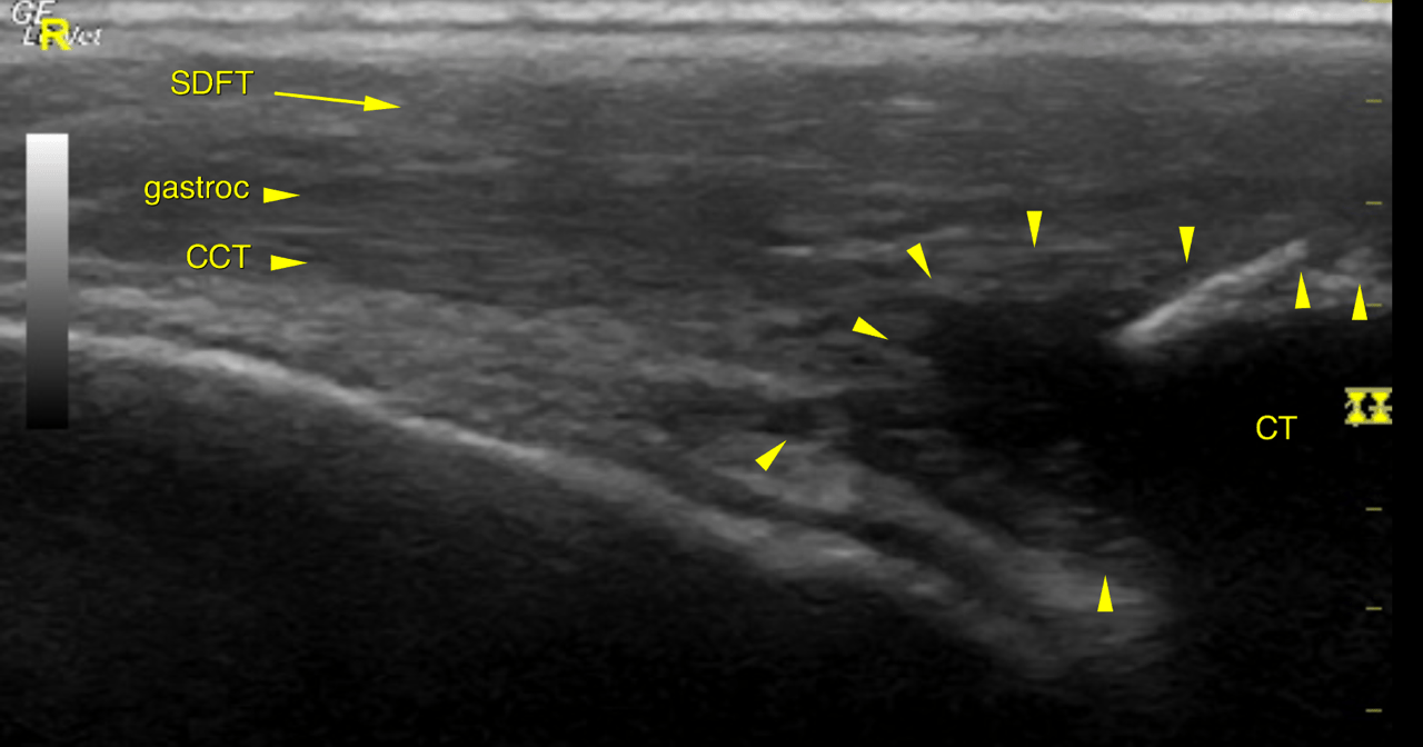 proximal from the calcaneal tubercle and comprises hypo- to anechoic regions next to