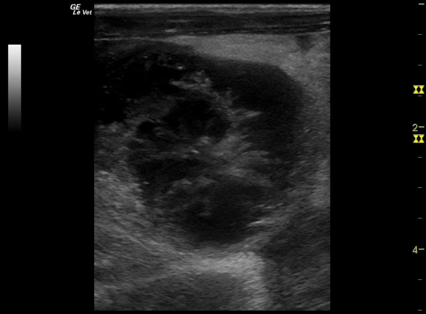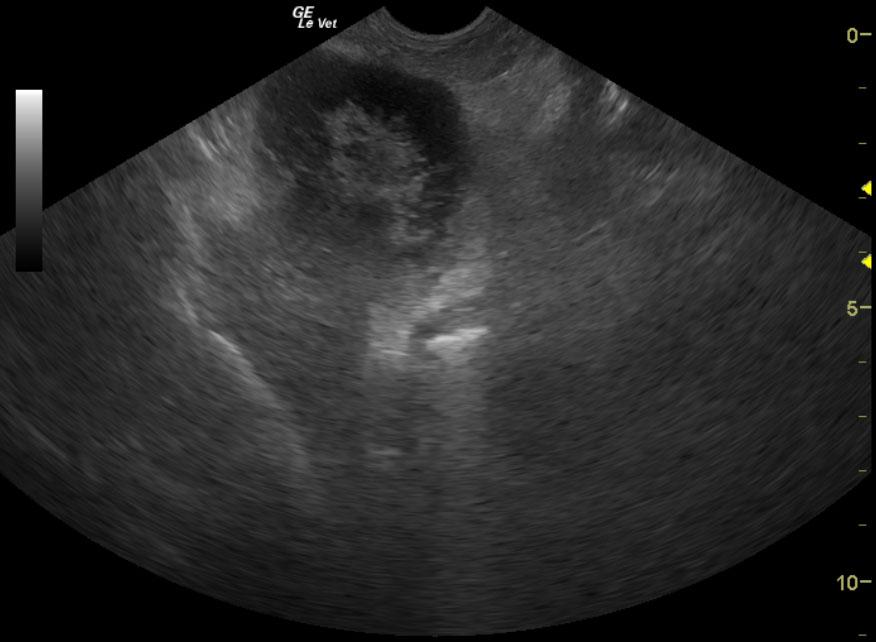 A 12-year-old NM Maltese with a history of pituitary dependent hyperadrenocorticism that was being treated with Lysodren was presented for vomiting, anorexia and not doing well over a 2-day period. Urinalysis showed an inappropriate SG (1.018), proteinuria, and bilirubinuria. Abnormalities on CBC and serum biochemistry were leukocytosis, severely elevated ALT and severely elevated ALP activity, hypoalbuminemia, bilirubinemia, and azotemia. The patient was treated with antibiotics, to which there was some response.