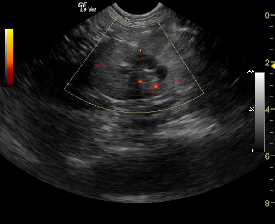 A 2-year-old MN DSH with history of azotemia was presented for increased thirst, decreased urination, and weight loss. Physical examination showed the patient to be quiet, alert and responsive. The rest of the examination was unremarkable. Urinalysis revealed a low-normal specific gravity and 1+ hematuria. CBC was within normal limits whereas marked azotemia was present on serum chemistry. Blood pressure measurements were high normal.