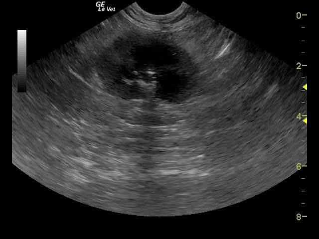 A 10-year-old FS DSH was presented for vomiting, lethargy, and anorexia. On physical examination, the patient was bright, alert and responsive, but had evidence of weight loss and dehydration. Also, the cat’s mucus membranes were pale pink, and there was a possible fluid wave in the abdomen. Urinalysis showed alkaline urine with normal specific gravity, 3+ proteinuria, 3+ hematuria, and leukocyturia. Urine culture yielded no growth. CBC was within normal limits. Blood chemistry showed azotemia, hypophosphatemia, and mild hyperglycemia.