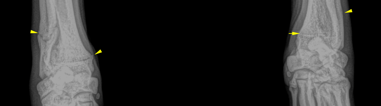 Physical Exam: Firm thickening palpated over right distal ulna, decreased extension of right carpus (mild) compared to left. Not painful on palpation, soft tissue feels normal.