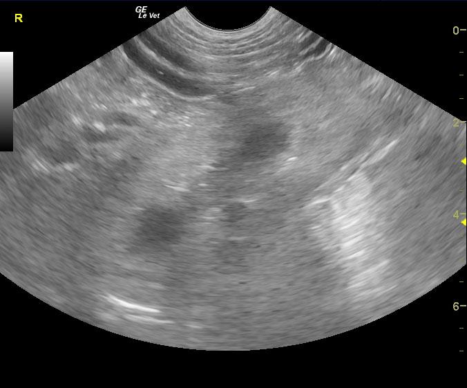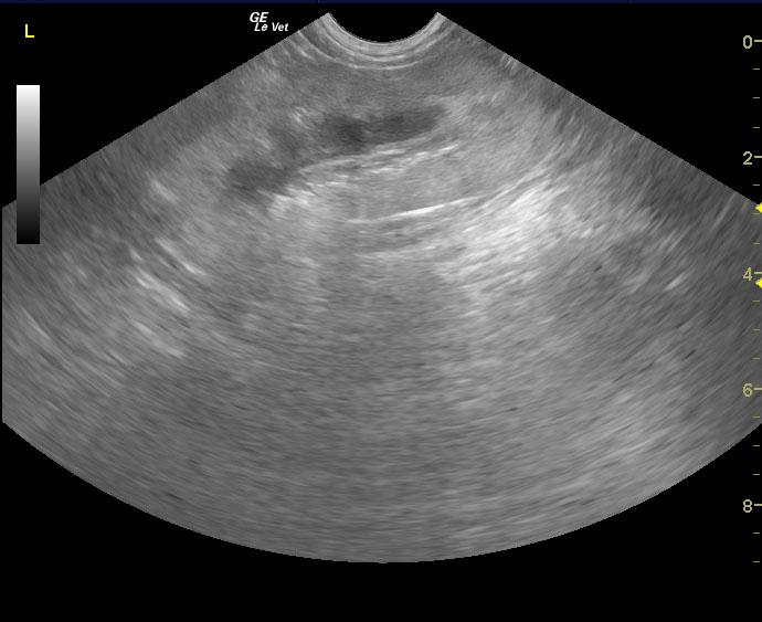 The kidneys in this patient presented an interstitial nephrosis pattern, disrupted corticomedullary definition and collapse of the cranial pole of the left cortex. Cortical infarcts were also present. The left kidney size appeared relatively normal to slightly subnormal depending on the weight of the patient. The left kidney measured approximately 6.0 cm. The right kidney revealed similar changes and measured approximately 6.0 cm.
