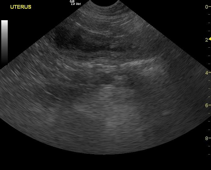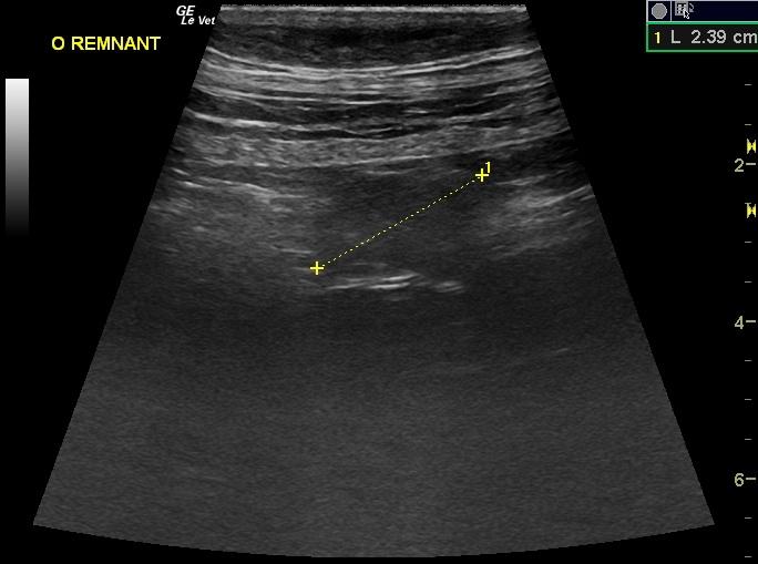 A 3.0 cm wide, fluid-filled uterine remnant was noted in this patient with a thickened wall. This is consistent with stump pyometra. This remnant continued into the level of the apex of the urinary bladder. Right ovarian remnant was also present at 2 x 2.25 cm and in normal position for an ovary.