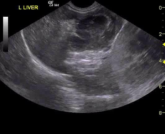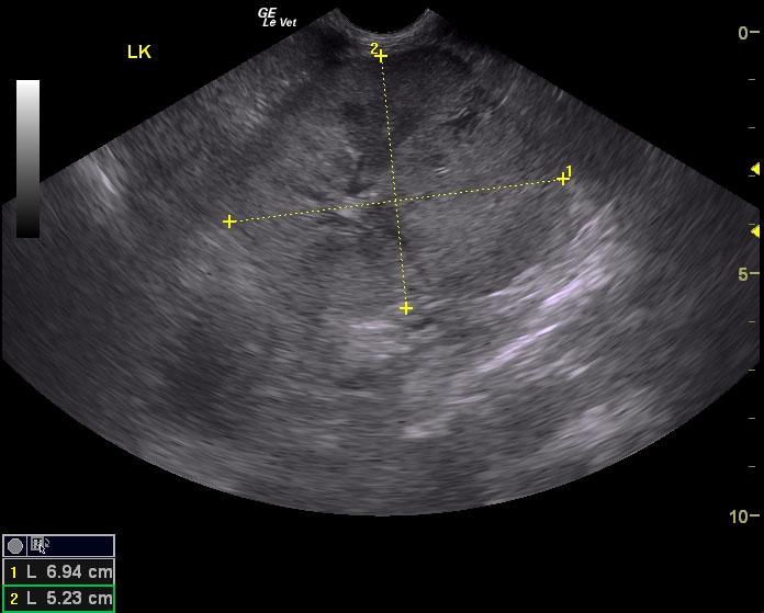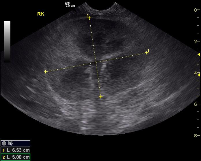 The right kidney was enlarged and measured 6.5 cm with pyelectasia and a pericapsular inflammatory pattern. Hypoechoic parenchyma with multifocal expansive contour was noted. The left kidney presented multiple nodular masses and capsular expansion. Subcapsular capping (the thin hypoechoic line just under the renal capsule) was noted around both kidneys. This is strongly suggestive for lymphoma. A mixed, hypoechoic mass was noted in the small intestine in the cranial abdomen. The mass measured 3.87 x 3.11 cm. Pericapsular inflammatory pattern was noted. The stomach was displaced cranially by the intestinal mass and was empty.