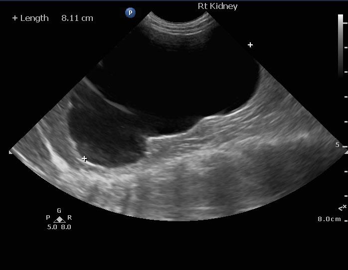 The left kidney was normal and measured 4.35 cm. The right kidney revealed complete hydronephrosis with echogenic debris. It measured 8.1 cm. The right ureter was dilated to the region approximately 3.0 cm caudal from the right renal pelvis. There was no visible parenchyma remaining in the right kidney.