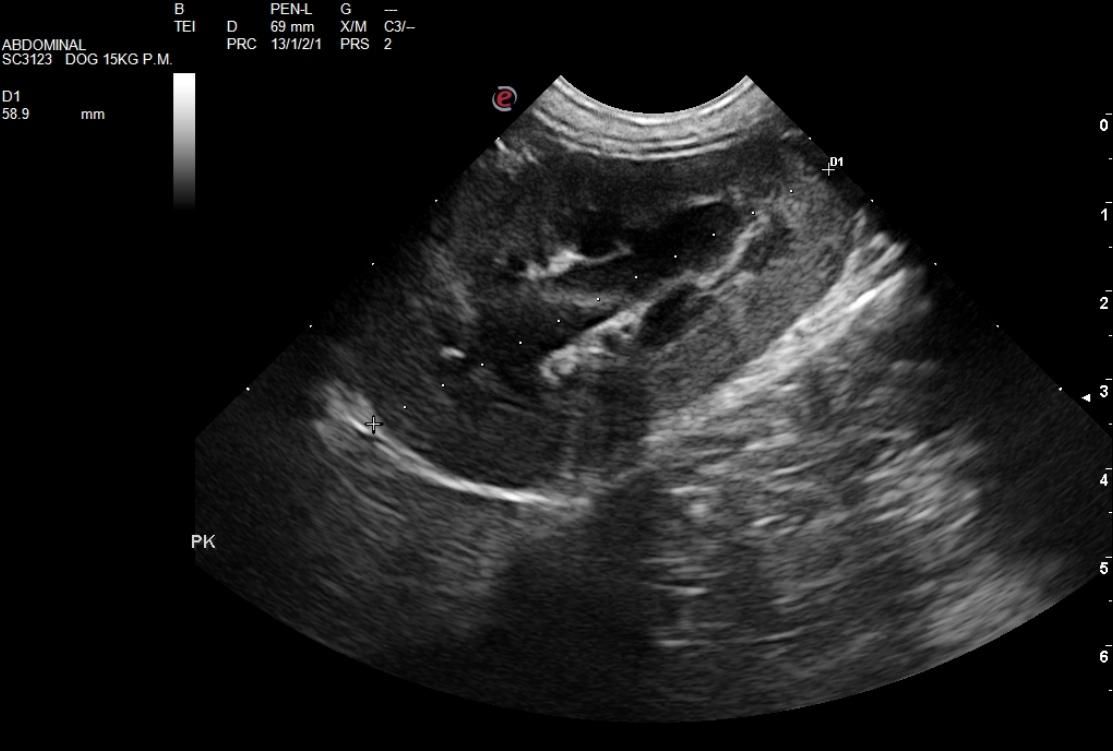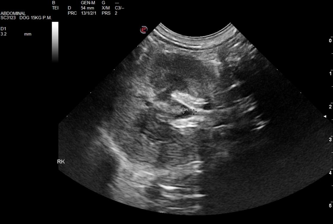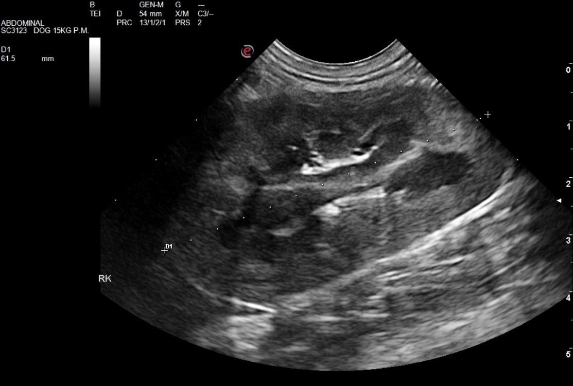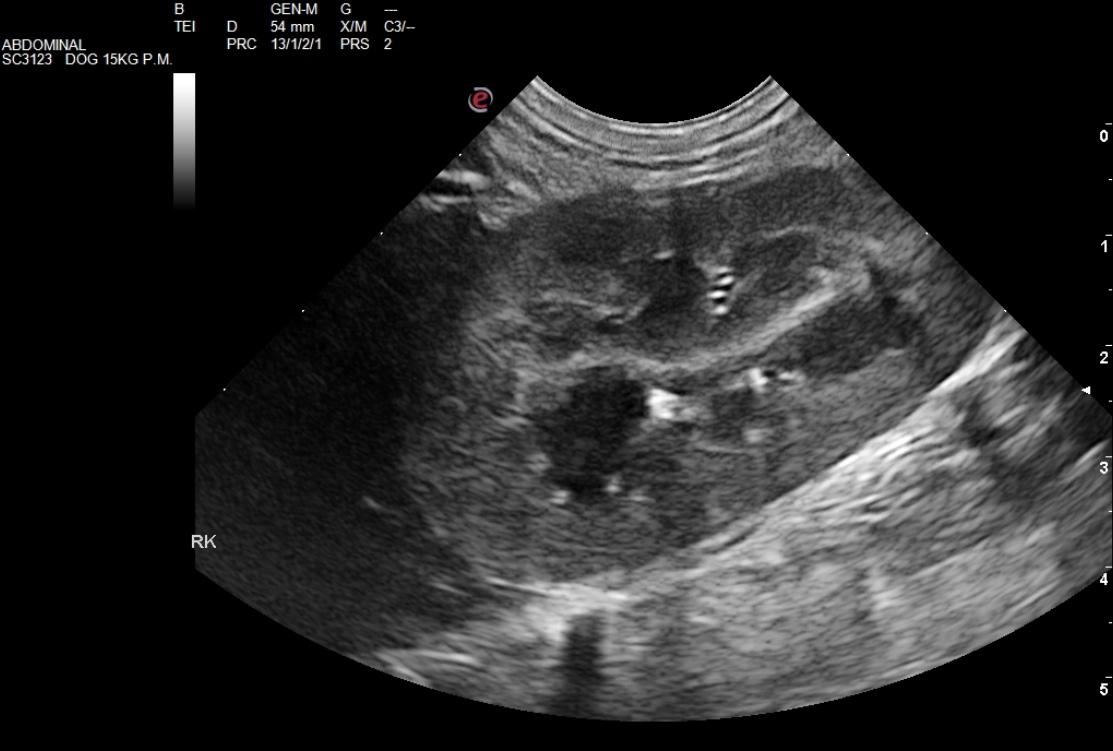 The right kidney presented pyelectasia that measured 0.3 cm with echogenic, ill defined fat and interstitial nephrosis pattern. The right kidney measured 6.15 cm. Pyelectasia was also noted in the left kidney at 0.36 cm with ill defined fat. The left kidney measured 5.9 cm.