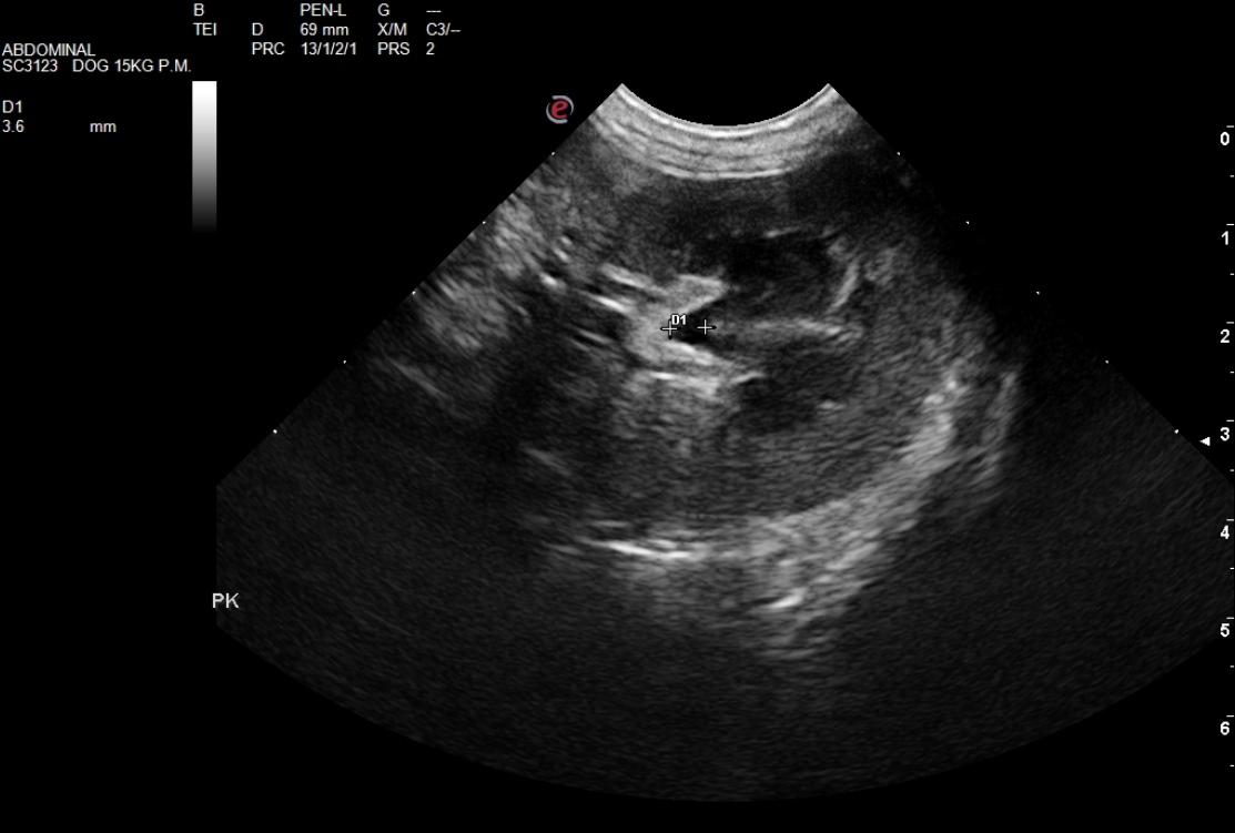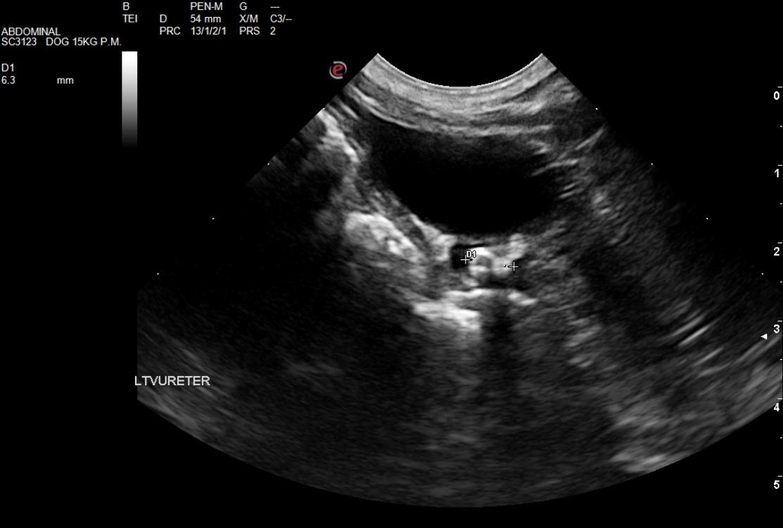 The urinary bladder itself did not present any calculi. However, the distal left ureter was obstructed with a 0.6 cm calculus that was embedded in the ureteral papilla. It was debatable on whether the calculus at this size will pass with aggressive fluid therapy and pain management. Surgical intervention with manual manipulation of the calculus may allow for it to enter into the bladder. Urine flow appeared to be present on color flow Doppler. However, a minor inflammatory pattern was noted around the ureter.