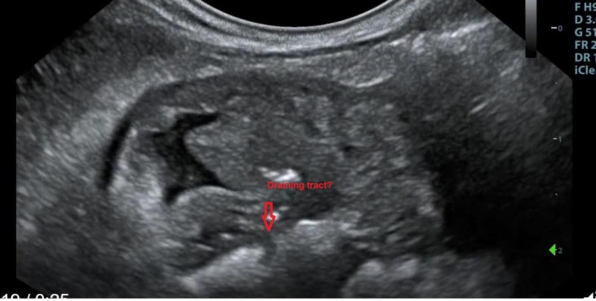 Unfortunately, this patient was too sick and while she was being stabilised, she vomited once again and then expired. Hardly 1.2kg, and the blood loss was very acute. One more thing, mucosa of this patient is mainly hyperechoic with a bright hyperechoic line on the luminal side. What could be the reason for that. Inflamation?