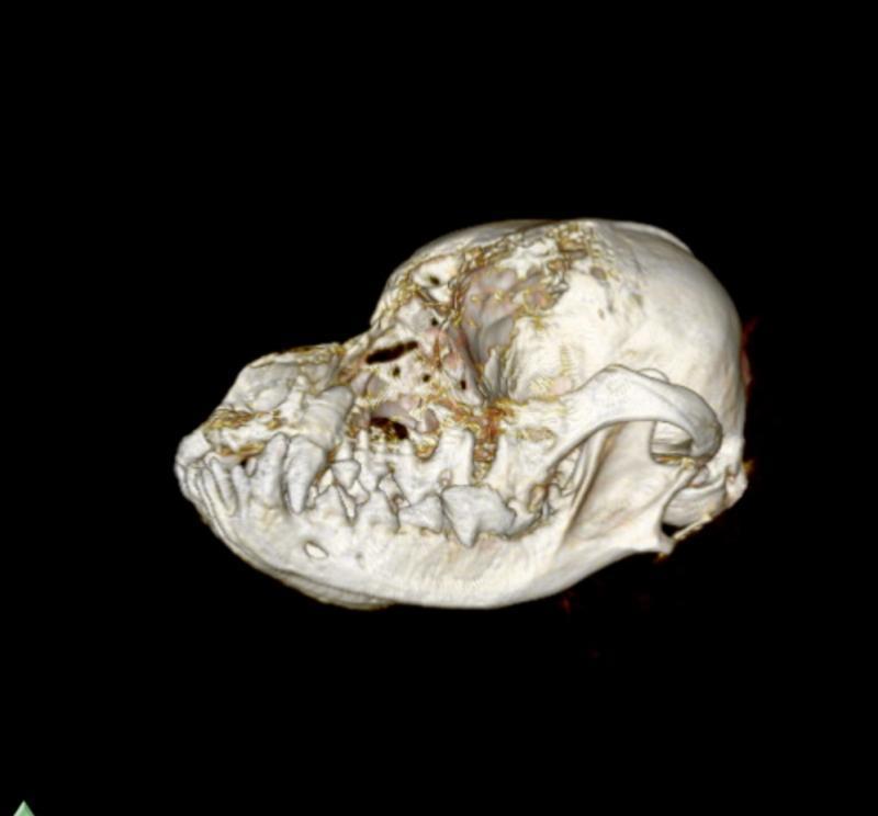 A significant asymmetric soft tissue swelling with a mass effect was seen on the dorsum of the nose and frontal bones. Both nasal cavities and the nasal fundus were almost entirely occupied by a soft tissue attenuating mass. The right frontal sinus was filled with soft tissue attenuating material. There was extensive bilateral asymmetric destruction of the maxillary, nasal and frontal bones. Severe turbinate and nasal septal lysis was seen as well as focal left-sided destruction of the frontal calvarial bone and cribriform plate creating an open connection to the cranial fossa and brain. On the left side the mass lesion penetrated the floor of the bony orbit and extended into the retrobulbar region associated with a mild unilateral exophthalmos. Furthermore, there was permeative lysis of the alveolar crest of the left maxillary bone and tooth root destruction of the cheek teeth.