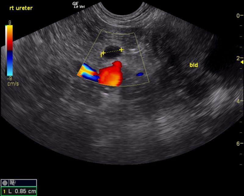 The urinary bladder presented a concentric, parenchymal mass that occupied most of the apical ventral and apical dorsal bladder with extensive polypoid changes entering into the caudal aspect of the ventral bladder and cystourethral junction. Dorsal polyps were also noted. Right hydroureter was noted which extended proximally to the right kidney with moderate to severe hydronephrosis. Hydronephrosis measured 3.82 x 4.0 cm. The right kidney measured 8.01 cm in length. The left kidney measured 7.0 cm with minor degenerative changes. No obstructive disease was noted. The iliac lymph node was enlarged in this patient, hypoechoic and irregular measuring approximately 2.0 cm. This is strongly suggestive for metastatic disease. Other small iliac lymph nodes were enlarged.