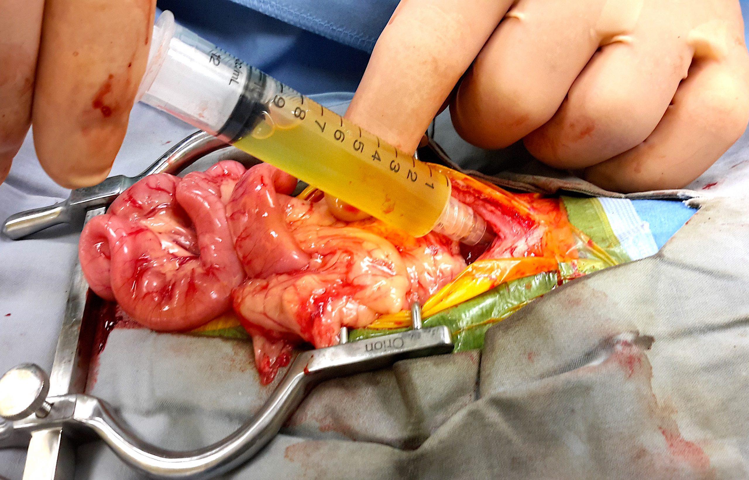 The patient underwent abdominal surgery to remove the cholelith from the papilla. The mass was removed at the same time and a partial intestinal anastomosis performed. This was rather difficult as it was located only millimeters distal to the area of the papilla which needed to be preserved. Biopsies were taken of the kidneys, pancreas, liver and the intestinal mass. Over 15 mls of fluid was aspirated from the CBD to help relieve the intra hepatic accumulations of bile. The cat made a full recovery and was eating well within two days of his surgery. Final biopsy results were the following: neutrophilic cholangiohepatitis, interstitial nephritis, fibrosing pancreatitis, large b cell intestinal lymphoma. The owners opted for no further treatments for their cat as they were worried that the medications may affect their pregnancy. The cat succumbed 5 months later at an emergency clinic from unrelated respiratory issues.