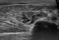 I do not see damage in the infra. One muscle that is only partially included further distal may have structural changes. See image below. But these finidngs are so suceptible to sound beam incidence and other technical factors – especially with the MyLab that.