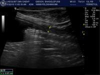 • Enlarged kidneys with moderate pelvis distention, hyperechoic heterogeneous cortex with partial loss or cortico-medular differentiation. Small non obstrutive calculi on both pelvis.